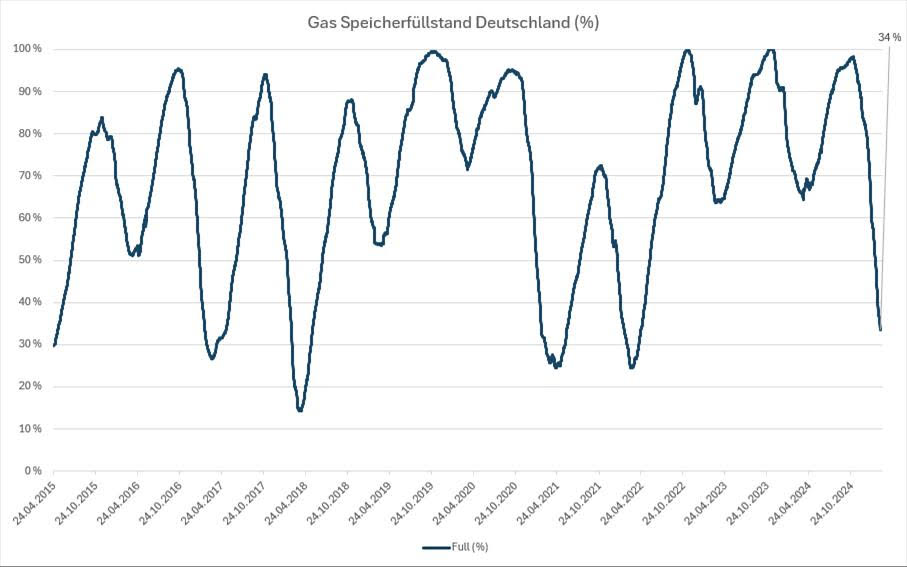 Aktuell beträgt der Füllstand der deutschen Erdgasspeicher 32 %. In der letzten Woche lag der Wert bei 34 %.