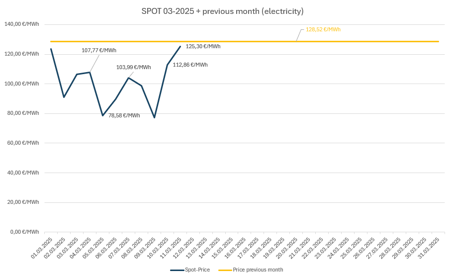 Der März mittelt derzeit bei 10,1 ct/kWh. Der Vormonat Februar wurde mit einem Mittel von 12,8 ct/kWh abgeschlossen