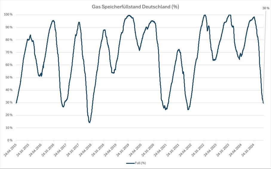 Aktuell beträgt der Füllstand der deutschen Erdgasspeicher 30 %. In der letzten Woche lag der Wert bei 32%.
