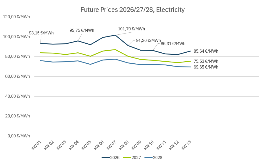 Das Frontjahr 2026 wird derzeit am Terminmarkt für knapp 8,5 ct/kWh gehandelt.