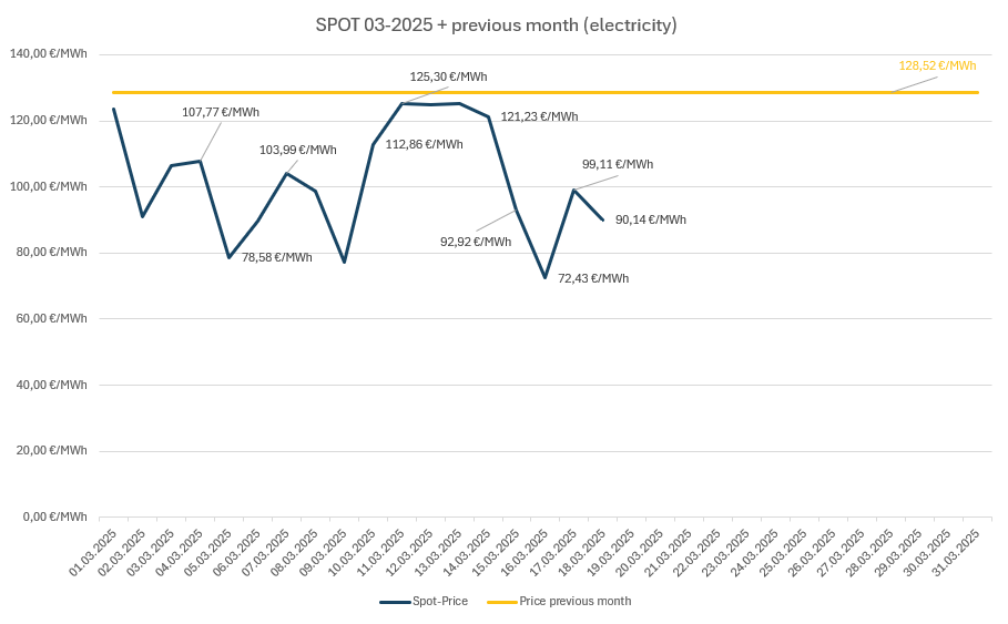 Der März mittelt derzeit bei 9,7 ct/kWh. Der Vormonat Februar wurde mit einem Mittel von 12,8 ct/kWh abgeschlossen