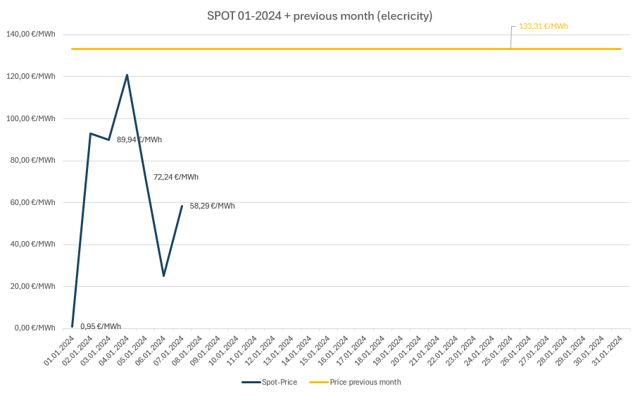 Der Januar mittelt derzeit bei 6,6 ct/kWh. Der Vormonat Dezember (2024) wurde mit einem Mittel von 13,3 ct/kWh abgeschlossen
