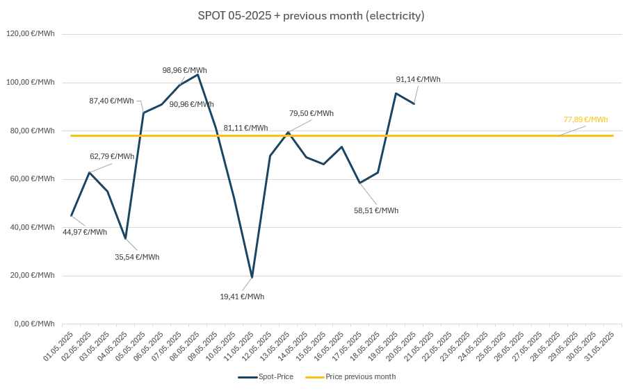 Der Mai mittelt derzeit bei 6,9 ct/kWh. Der Vormonat April wurde mit einem Mittel von 7,8 ct/kWh abgeschlossen