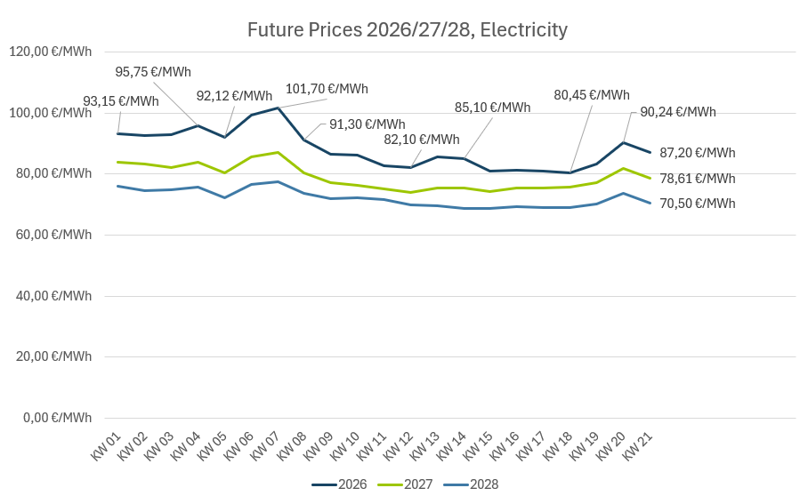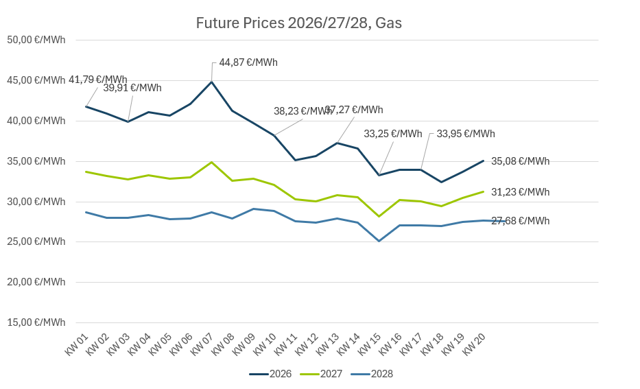 Seitwärtsbewegung erwartet -Für die kommende Woche werden weitgehend neutrale Preisentwicklungen erwartet, da Aufwärtsimpulse wie etwa konjunkturelle Stärke und Marktstimmung nachlassen. Bei CO₂-Zertifikaten (EUAs) sind nach starkem Anstieg Gewinnmitnahmen wahrscheinlich; zusätzlich könnten Gespräche über eine Fusion mit dem britischen Emissionshandelssystem preisdämpfend wirken. Gas- und Ölpreise bleiben unter Druck, vor allem durch ein gutes Angebot, sinkende Nachfrageerwartungen sowie die Aussicht auf weitere Friedensgespräche zwischen Russland und der Ukraine.