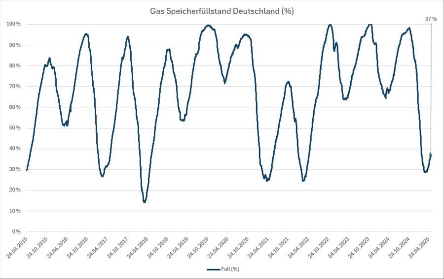 Aktuell beträgt der Füllstand der deutschen Erdgasspeicher 37 %. In der letzten Woche lag der Wert bei 35%.