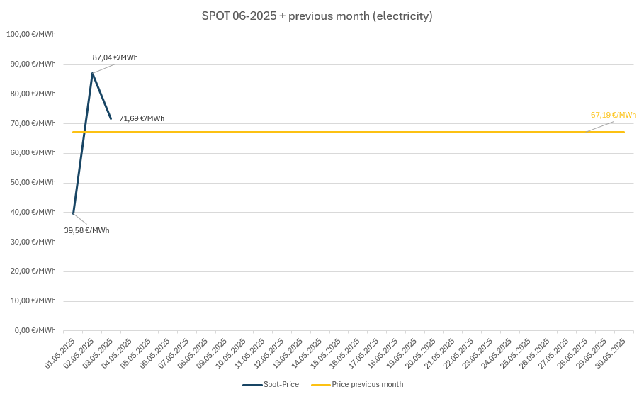 Der Juni mittelt derzeit bei 3,4 ct/kWh. Der Vormonat Mai wurde mit einem Mittel von 3,5 ct/kWh abgeschlossen