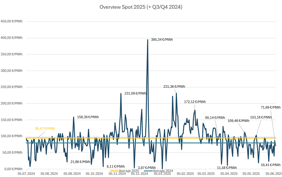 Das Jahr 2025 mittelt derzeit somit bei ca. 9,5 ct/kWh. Das Jahr 2024 wurde mit einem Durchschnittspreis von 7,9 ct/kWh abgeschlossen.