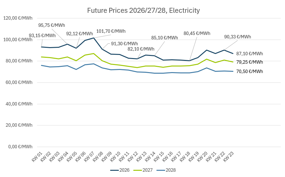 Das Frontjahr 2026 wird derzeit am Terminmarkt für knapp 8,7 ct/kWh gehandelt.