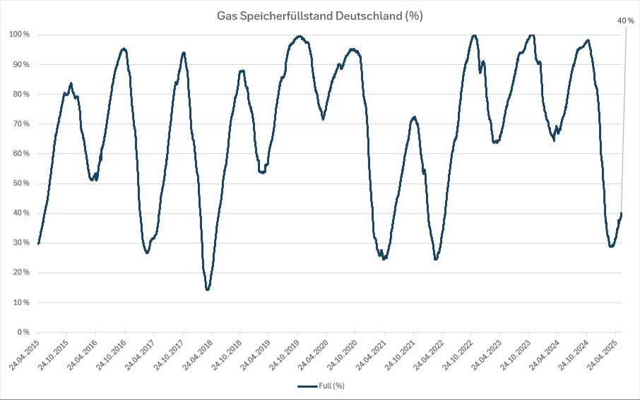 Aktuell beträgt der Füllstand der deutschen Erdgasspeicher 40 %. In der letzten Woche lag der Wert bei 38%.