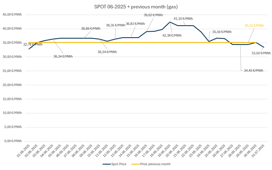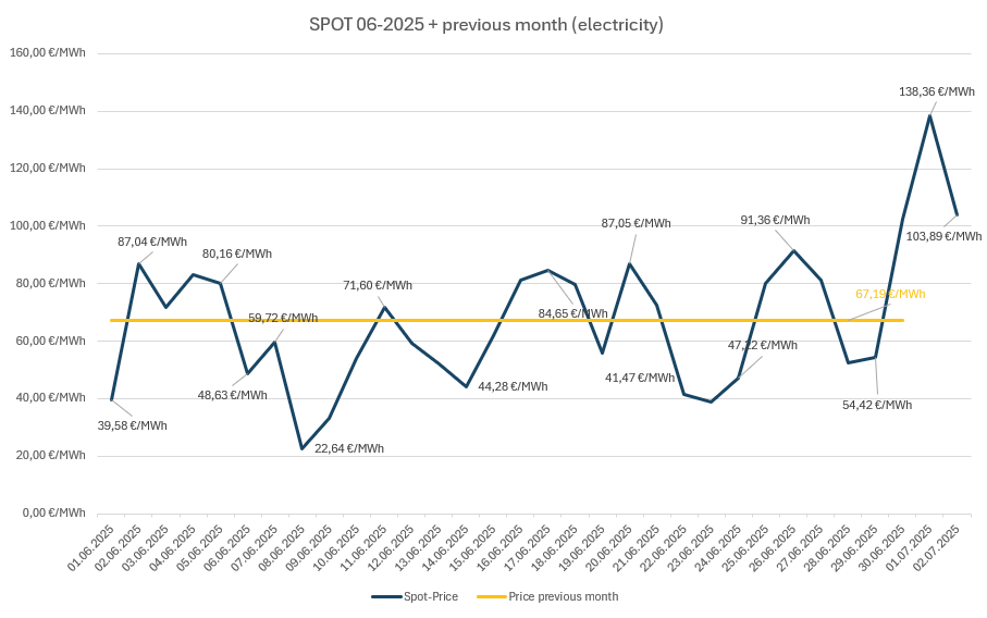 Der Monat Juni wird mit einem Mittel von 6,3 ct/kWh abgeschlossen. Der Vormonat Mai wurde mit einem Mittel von 6,7 ct/kWh abgeschlossen