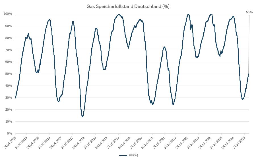 Aktuell beträgt der Füllstand der deutschen Erdgasspeicher 50 %. In der letzten Woche lag der Wert bei 49%.