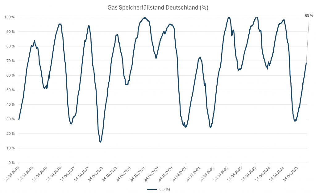 Aktuell beträgt der Füllstand der deutschen Erdgasspeicher 69 %. In der letzten Woche lag der Wert bei 67 %.