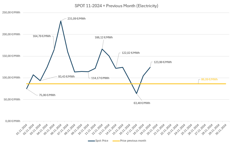 Der November mittelt derzeit bei 12,4 ct/kWh. Der Vormonat Oktober wurde mit einem Mittel von 8,6 ct/kWh abgeschlossen