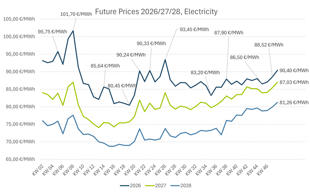 Das Frontjahr 2026 wird derzeit am Terminmarkt für knapp 9,0 ct/kWh gehandelt.