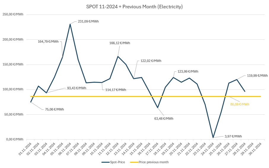 Der November mittelt derzeit bei 11,3 ct/kWh. Der Vormonat Oktober wurde mit einem Mittel von 8,6 ct/kWh abgeschlossen