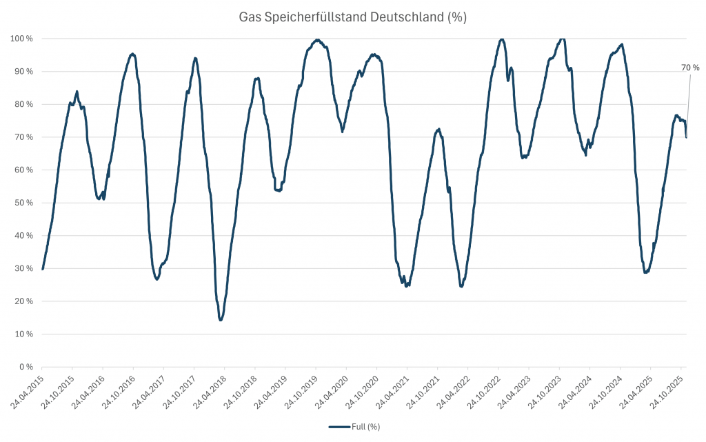 Aktuell beträgt der Füllstand der deutschen Erdgasspeicher 70 %. In der letzten Woche lag der Wert bei 74 %.