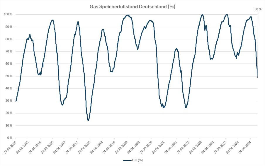 Aktuell erreichen die deutschen Erdgasspeicher weiterhin einen Füllstand von 50 %.