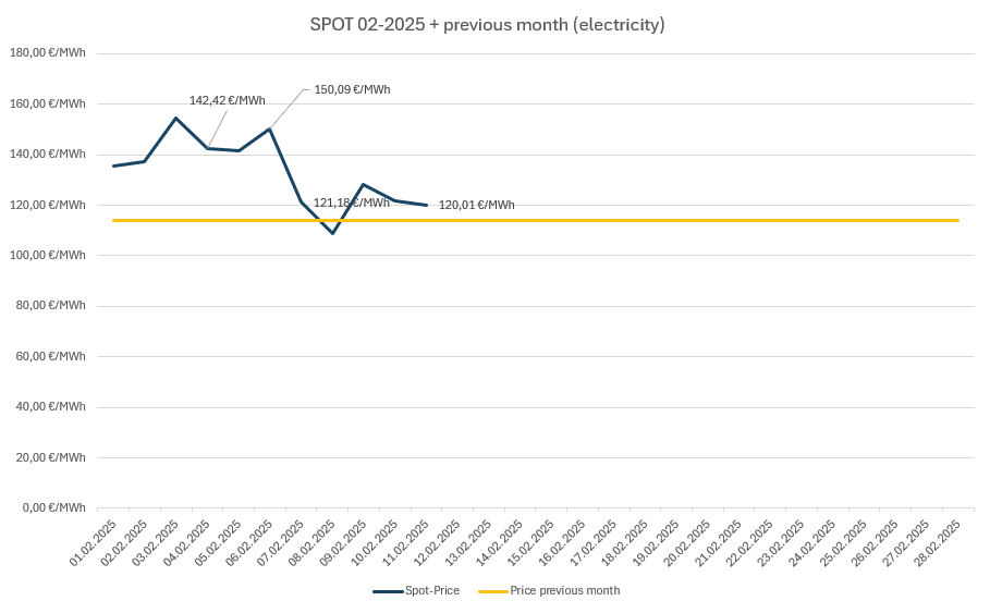 Der Februar mittelt derzeit bei 13,2 ct/kWh. Der Vormonat Januar wurde mit einem Mittel von 11,4 ct/kWh abgeschlossen