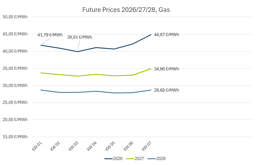 Steigende Gaspreise und CO₂-Kosten erwartet -Für die kommende Woche wird eine Fortsetzung des Gaspreisanstiegs erwartet, da die Temperaturen unter dem Durchschnitt bleiben und sich der Speicherfüllstand in Europa deutlich unter dem Vorjahresniveau befindet (-18,3 Prozentpunkte). Die erwartete Angebotsknappheit durch den auslaufenden Ukraine-Transit sowie die steigende Nachfrage nach LNG dürften zusätzlich Druck auf die Preise ausüben. Auch CO₂-Zertifikate und Strompreise könnten weiter steigen, da eine geringe Auktionsmenge an EUA-Emissionsrechten auf dem Markt verfügbar ist und die höhere Kohlenutzung zu einer steigenden Nachfrage nach CO₂-Zertifikaten führt.