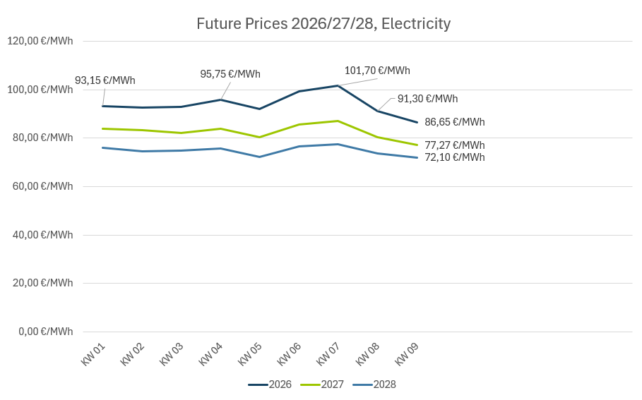 Das Frontjahr 2026 wird aktuell für ca. 3,9 ct/kWh gehandelt.
